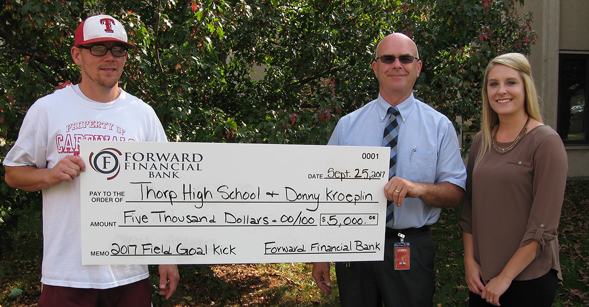 Forward Financial Bank sponsored a $5,000 Field Goal Kick on September 1, 2017 at the Thorp Cardinals football game.The lucky kicker, Donald Kroeplin, was selected at random from the crowd to attempt a 25-yard field goal kick for a chance to win $2,500 for himself and $2,500 for the school’s athletic program.
